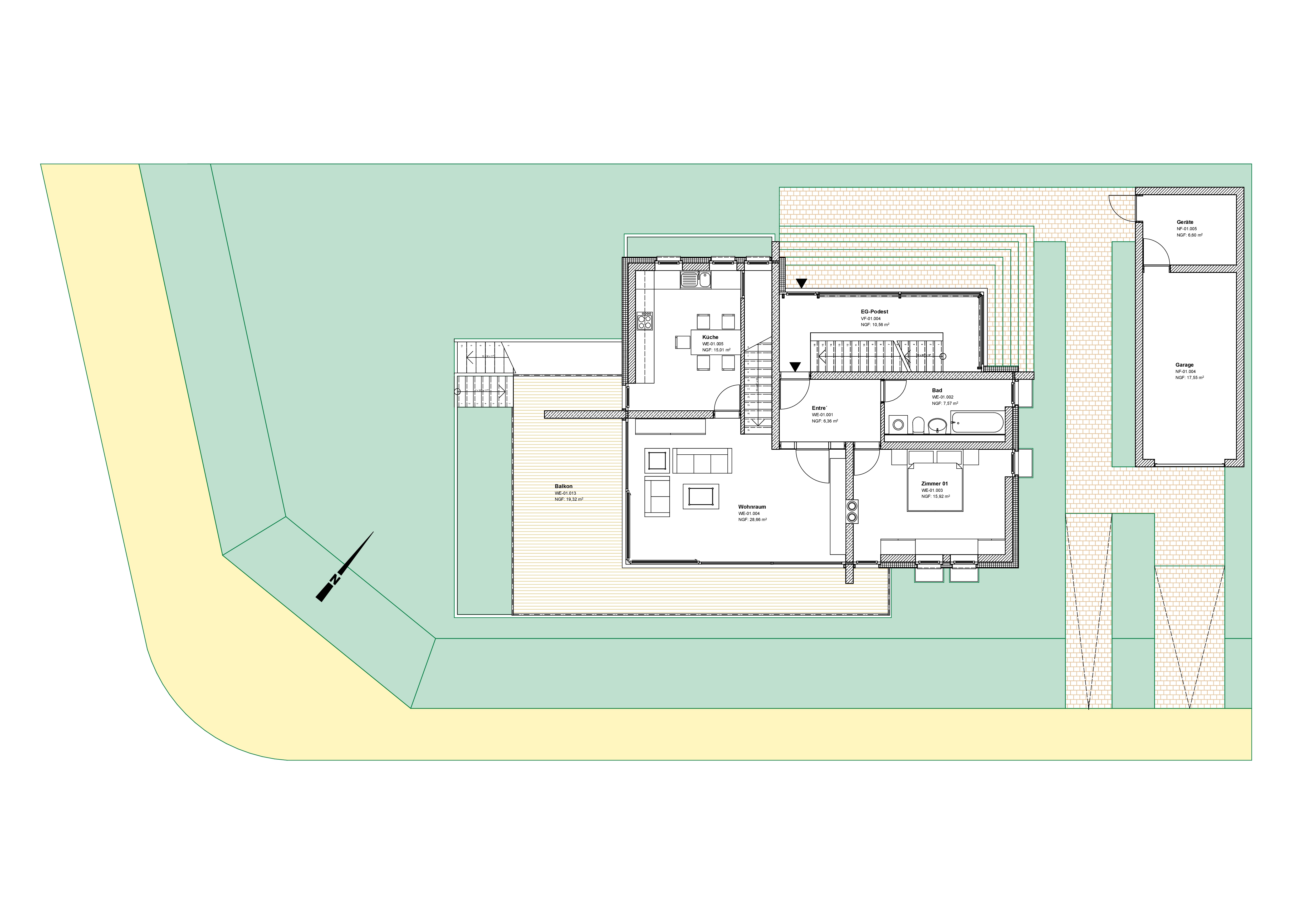 Die Erschließung erfolgt von der östlich gelegenen Nebenstraße zum nördlich angelegten Treppenraum.